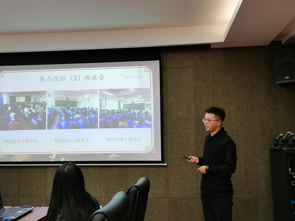 四位实习生代表分别从三个方面报告:一是教学实习方面,包括听课、参加教研活动、课前备课、上台讲课、监考、批作业等;二是在班主任实习方面,参与、组织班会等各种班级活动,分享了自己实习期间的所见所闻;三是分享实习期间的收获与感悟,总结了自己在备课时从慌乱到有条理性、讲课时从紧张到从容等,以及今后还需要继续努力的方向。