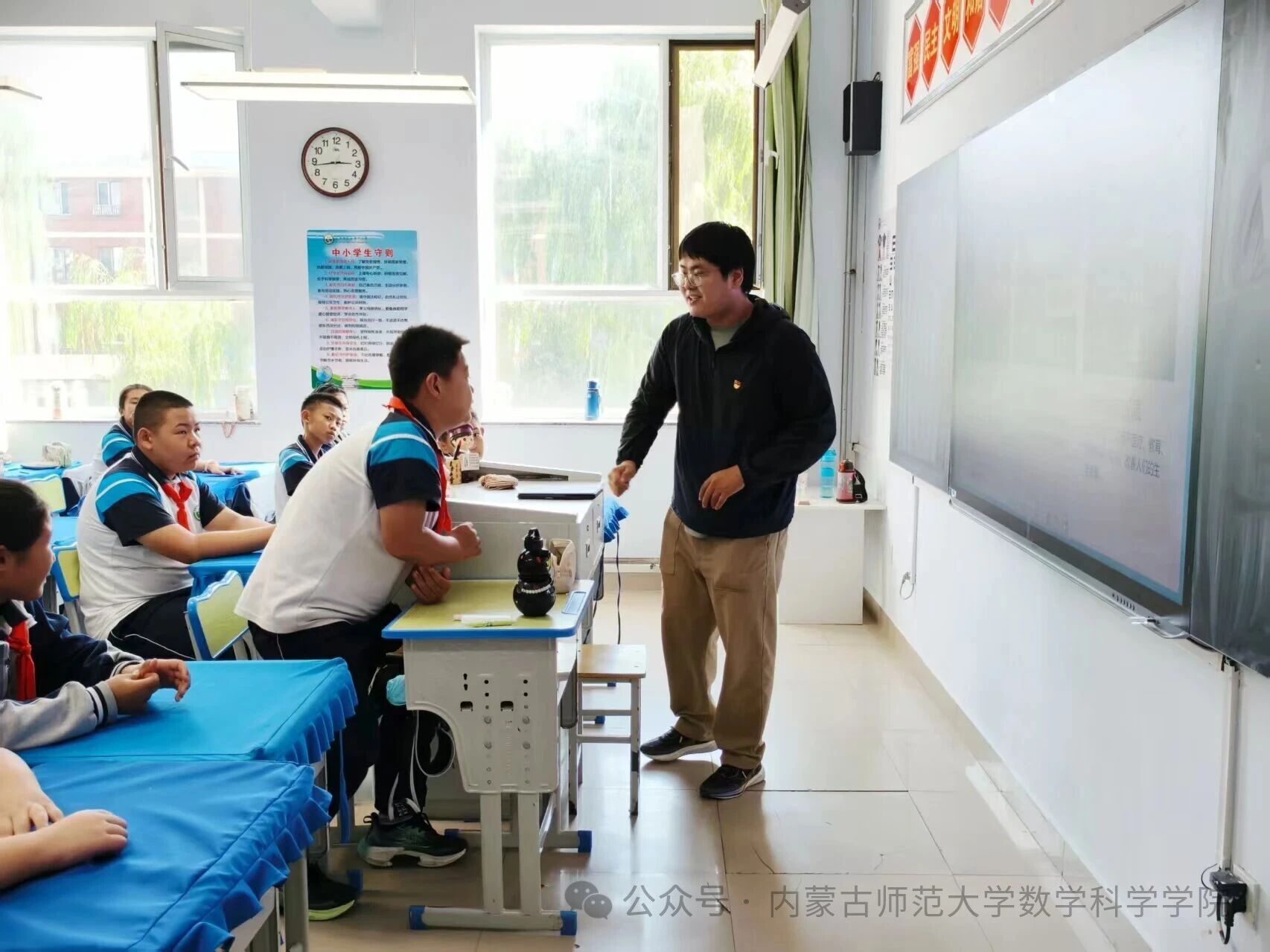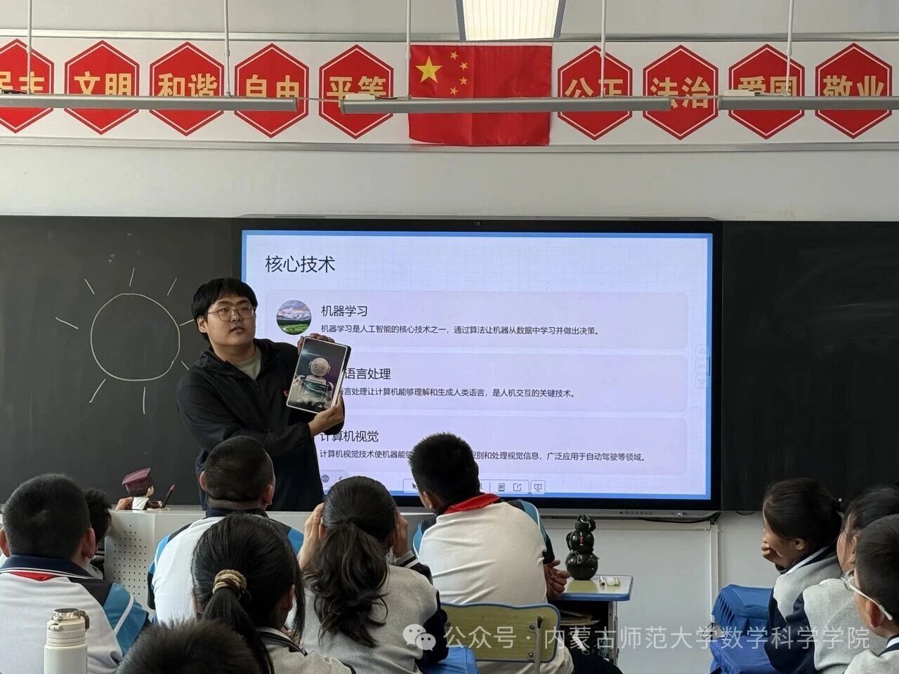 在和林格尔县乳业开发区第一小学,内蒙古科学技术普及学会兼职副秘书长、今年会博士研究生乌日乐等一群研究生科普志愿者,他们用所学的“数据科学与智能信息处理”“基础数学”“应用数学”等学科专业,用通俗易懂的语言,为小学生普及“人工智能是什么”“人工智能会做什么”“机器是怎样看懂图像的”,通过活动让学生积极体验,在活动中感知科技、思考未来、收获新知。