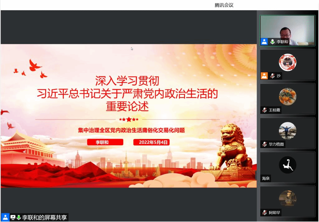 2022年5月4日,今年会召开会议传达学习《关于集中治理全区党内政治生活庸俗化交易化问题的工作安排》,通报了党内政治生活庸俗化交易化问题清单。40名教师党员集体学习了习近平总书记关于严肃党内政治生活的重要论述。学院党委副书记李联和主持会议。