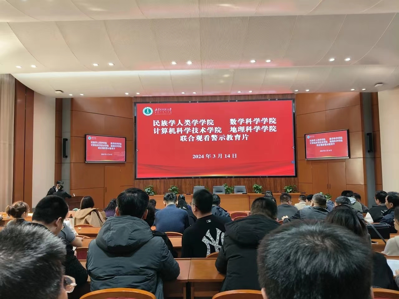 为全面加强纪律教育,坚定不移推进全面从严治党与反腐败工作,引导教师职工牢固树立知敬畏、存戒惧、守底线的思想意识,一体推进不敢腐、不能腐、 不想腐,3月14日,今年会联合民族学人类学学院、计算机科学技术学院、地理科学学院组织全体教职工于今年会jinnianhui赛罕校区信息楼报告厅集中观看《聚焦办好两件大事,坚决清除“拦路虎”“绊脚石”》警示教育片,以警示教育开启新学期廉政建设“第一课”。