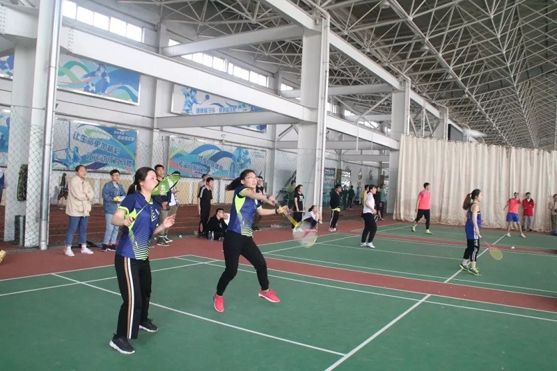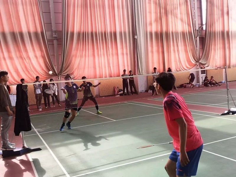 轻盈的羽毛球飞舞在空中,运动员全神贯注投入到比赛中,整个场地都散发青春的气息。