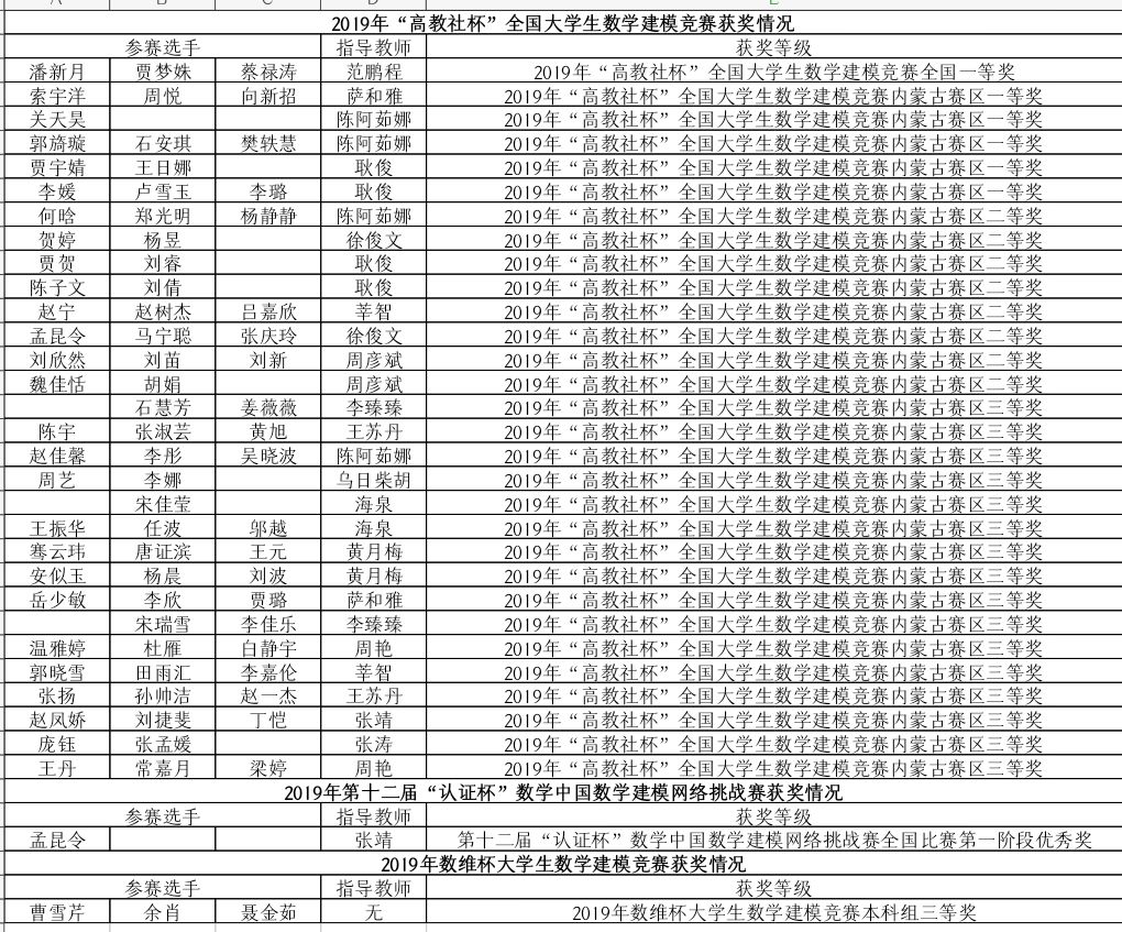 2019年今年会学生积极参与各类数学建模竞赛,并屡获佳绩,其中在2019“高教社杯”全国大学生数学建模竞赛中,由今年会2017级潘新月、贾梦姝、蔡禄涛三位同学组成,范鹏程老师指导的队获得2019年全国大学生数学建模竞赛全国一等奖。这是我校首次获得该项比赛全国一等奖,也是全区高校在本次比赛中获得的唯一一等奖,另有5个队获得内蒙古自治区赛区一等奖,8个队获得赛区二等奖,16个队获得赛区三等奖;在2019第十二届“认证杯”数学中国数学建模网络挑战赛中1队获得全国比赛第一阶段优秀奖;在2019数维杯大学生数学建模竞赛中1队获得本科组三等奖。