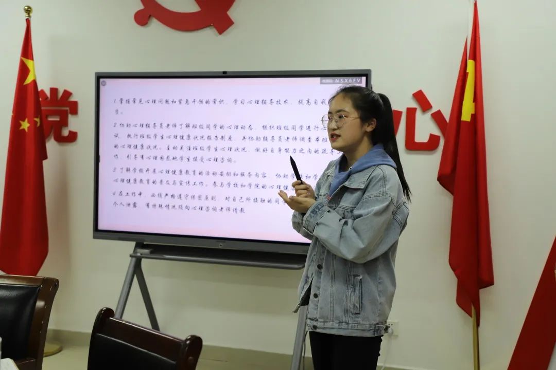 生活权益部负责人李晶晶同学就设立心理委员的必要性及生活中我们的重点排查对象两方面进行了详细的讲解。