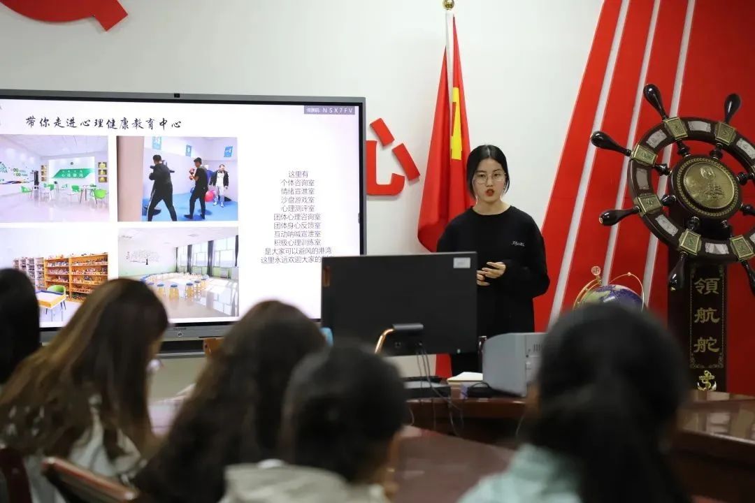 生活权益部负责人美玲同学介绍了我校心理方面的建设,从心理咨询时间到预约方式,从心理健康室到馆内设施进行全方面介绍。