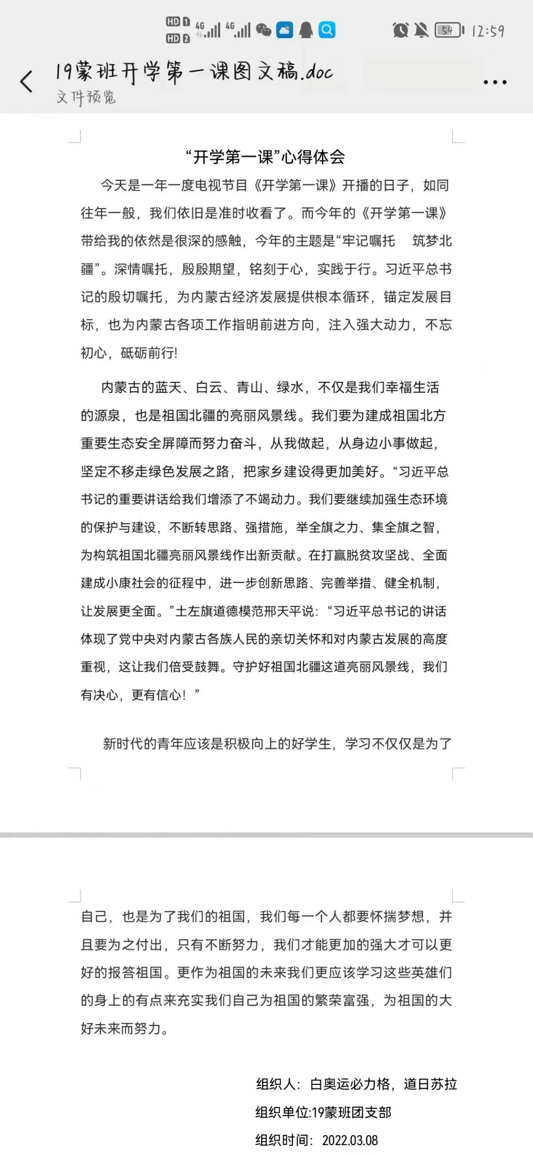 为深入贯彻落实习近平总书记在内蒙古重要讲话重要指示批示精神以及中央办公厅、国务院办公厅发表的文件要求,统筹推进全区大中小学思政课一体化建设,进一步加强青少年铸牢中华民族共同体意识教育,自治区教育厅联合内蒙古广播电视台录制了全区大中小学生“开学第一课”。新学期伊始,今年会积极响应学校号召,组织全体师生共同收看以“牢记嘱托,筑梦北疆”为主题的“开学第一课”。