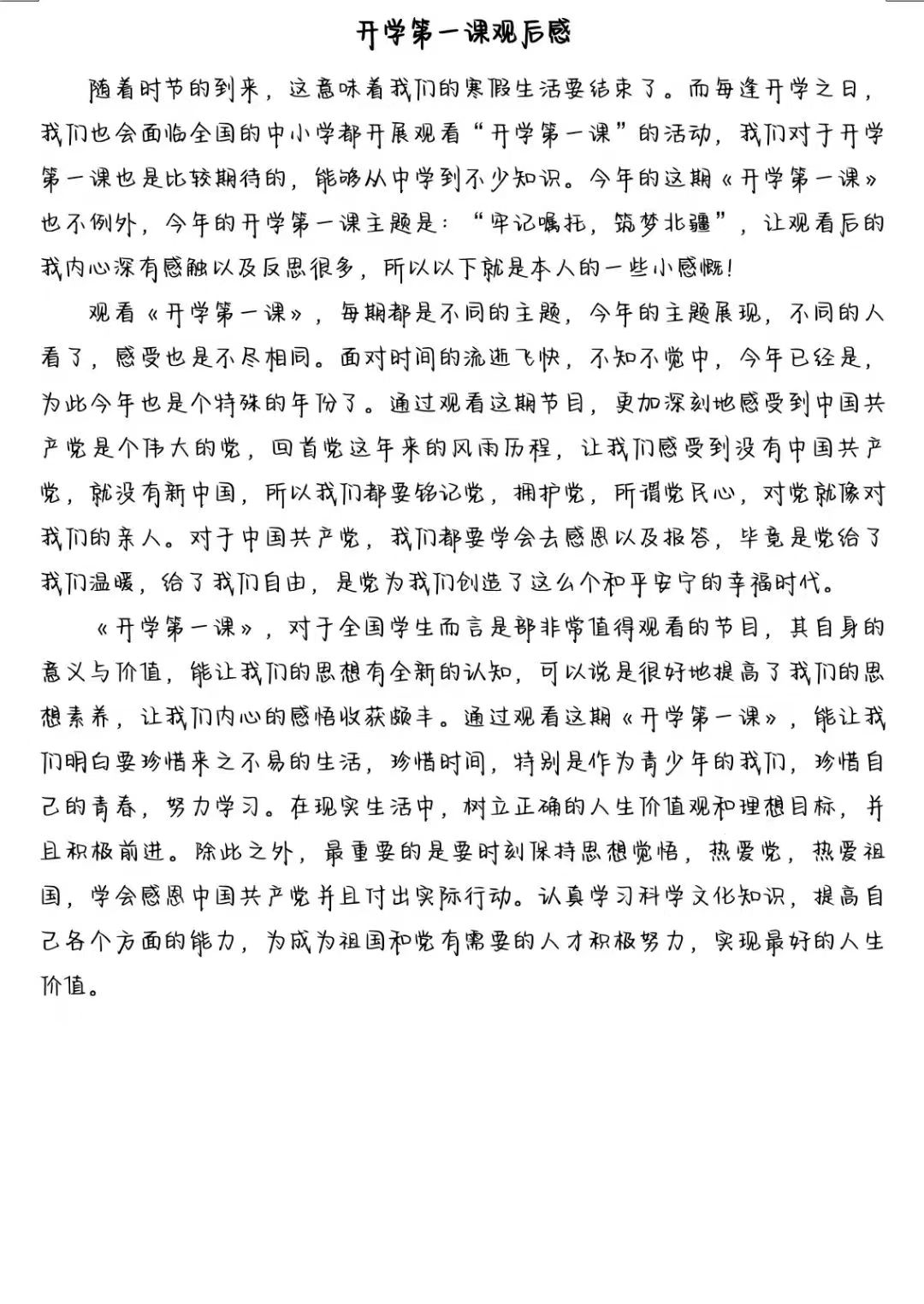 “开学第一课”注重学生引导认真学习、用心感受、深入思考、让党史教育爱国主义教育、民族团结进步教育入脑入心,真正达到启智润心的效果。通过本次观看,希望同学们能够深刻认识“牢记嘱托,筑梦北疆”的内涵与实质,肩负起属于青年人的责任担当以及历史使命,出色完成学业,锻炼自身本领,不断提高内核,努力成为新时代的有力建设者。