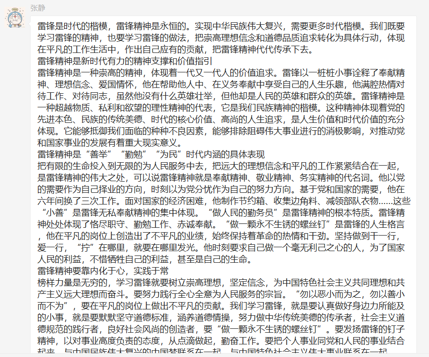 “我要把有限的生命,投入到无限的为人民服务之中去。”时间在变,形势在变,但“雷锋精神“的内核始终不变,时至今日,我们身边仍有“雷锋”的身影,他们是白衣战士,义无反顾,冲锋一线;他们是社区工作者,昼夜不息,筑牢防线;他们是城市守护人,坚守岗位、担当奉献;他们是党员志愿者、青年志愿者;他们有一个共同的名字:“雷锋”!向身边的“新时代雷锋”致敬!