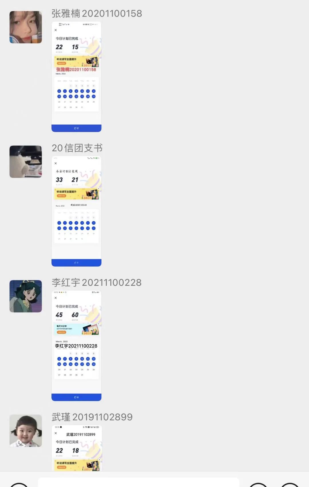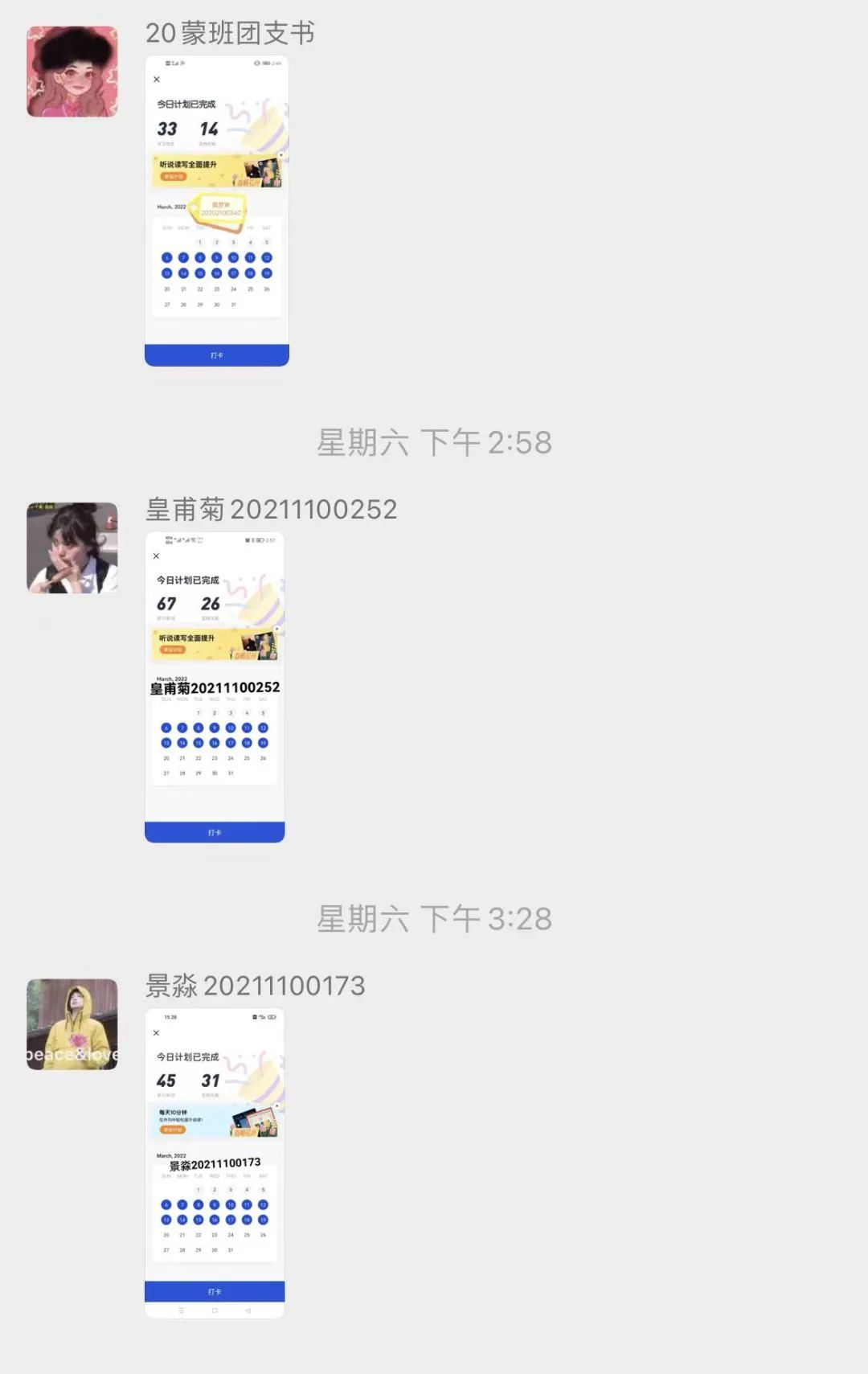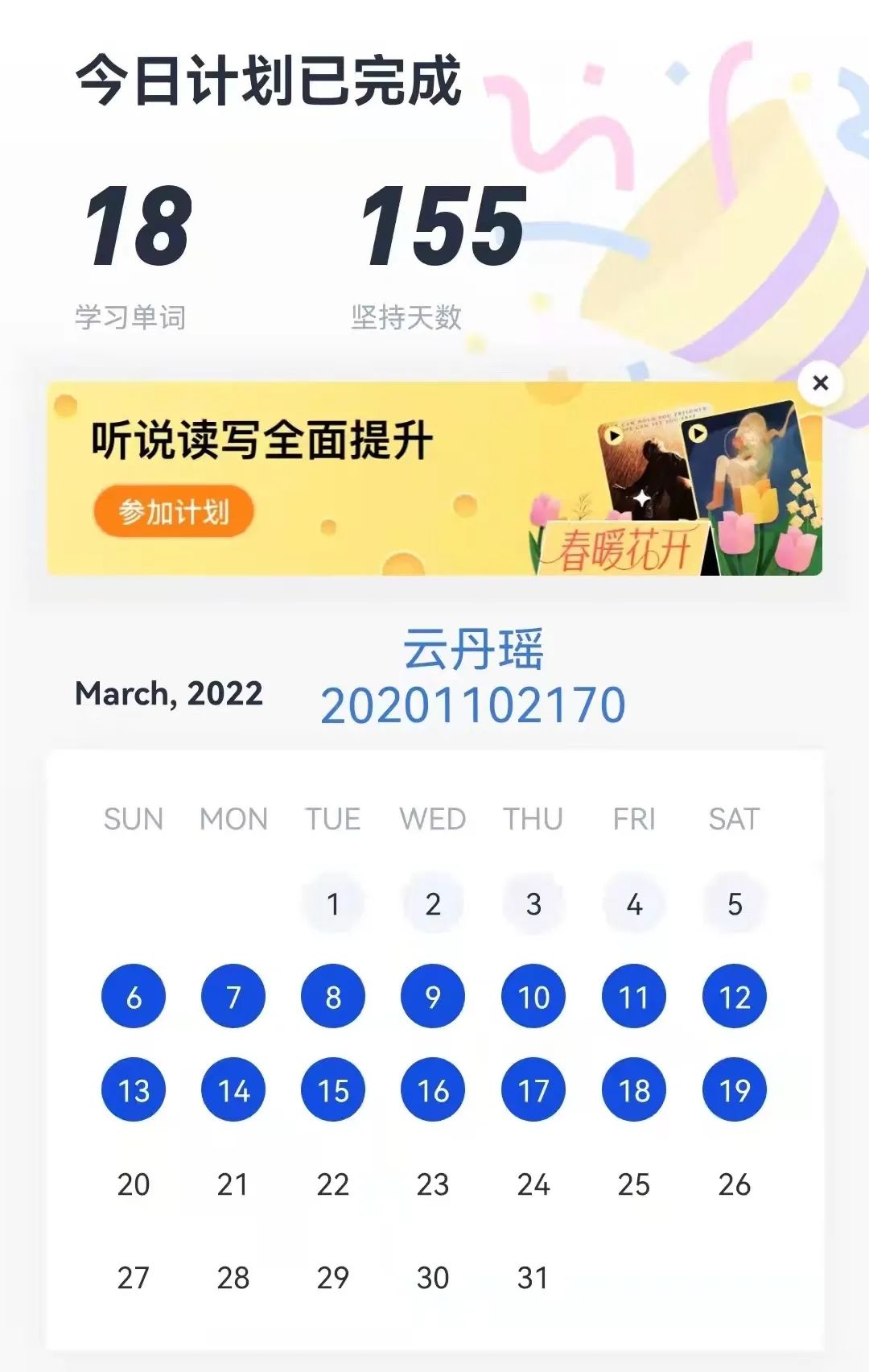 为了丰富学生的居家学习生活,提高学生的学习自觉性,今年会开展了“学习解疫,提升有我”的英语单词打卡活动,150名学生积极响应活动,进行打卡学习。