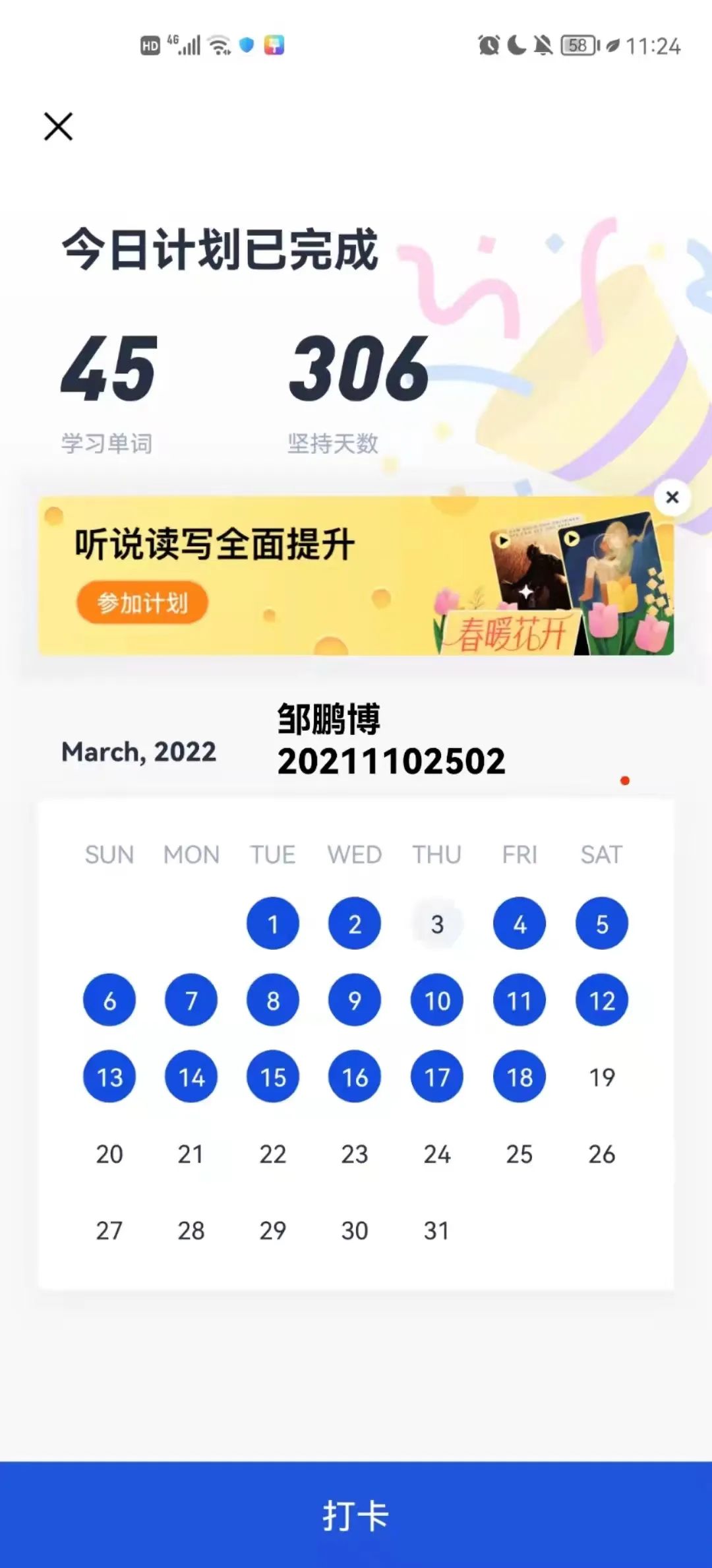 这次的单词打卡活动让同学们提高了学习的自觉性,我们更加愿意积极主动地去学习英语。打卡时候的成就感让我开心不已,我也愿意坚持下去,想看看我能走到多远。一天天的积累学习,也让我们离理想的自己更进一步。不积跬步,无以至千里。让我们一起努力吧!