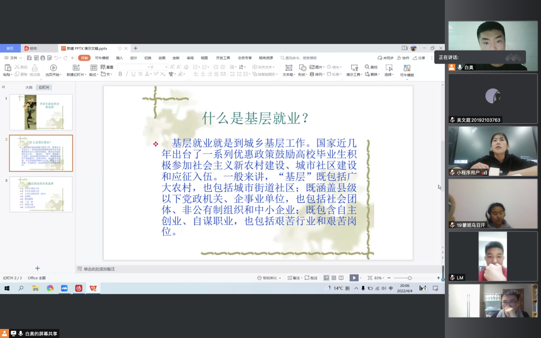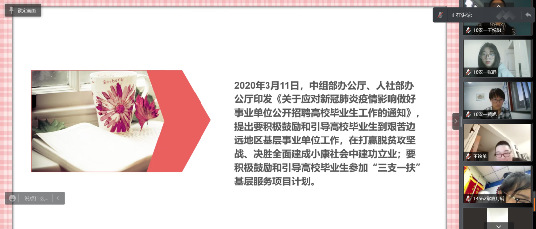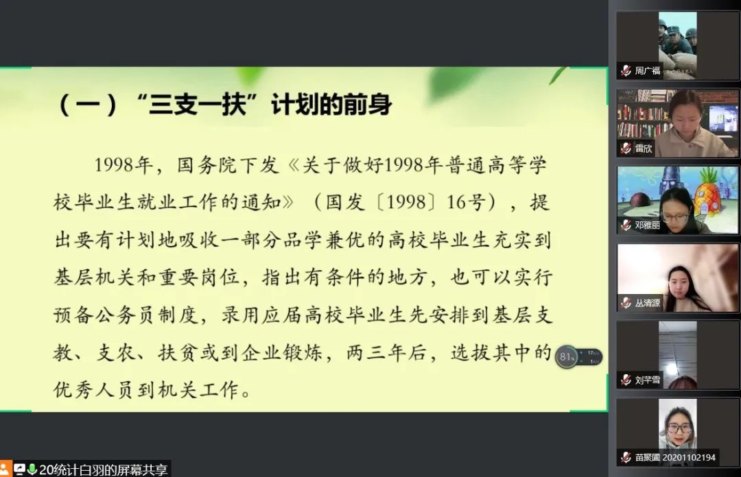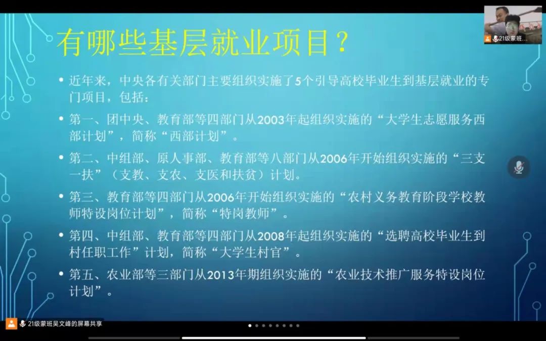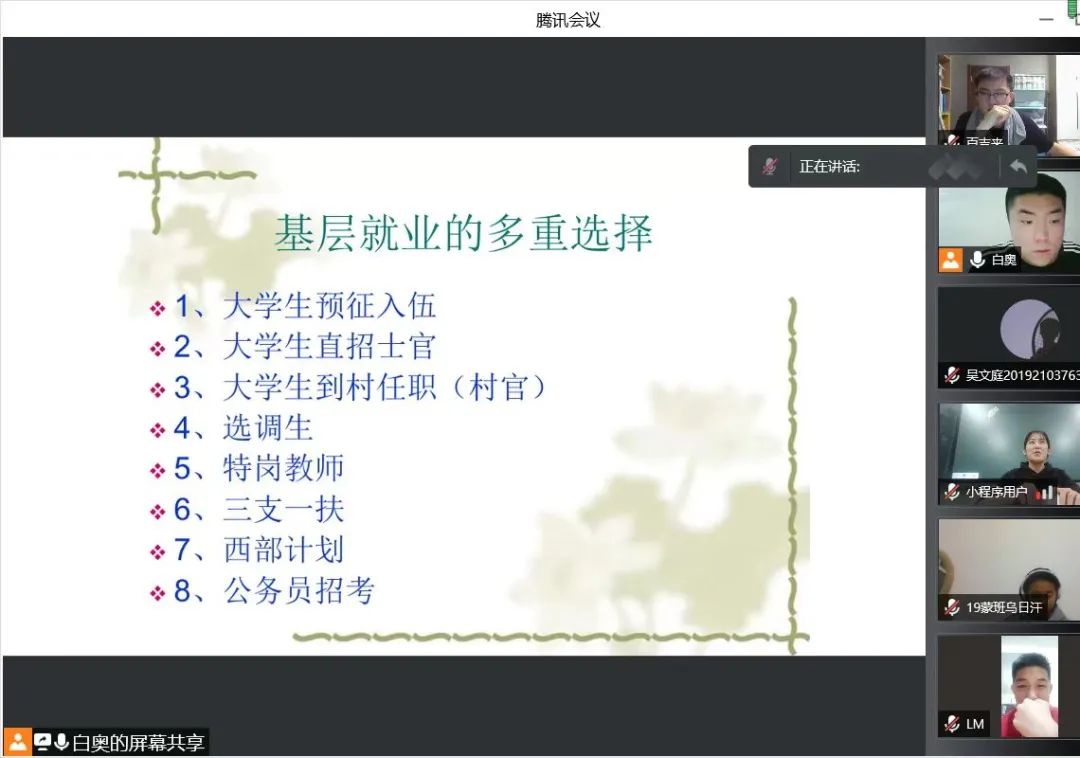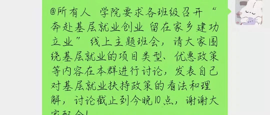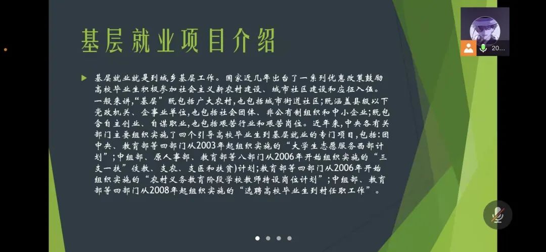 国家近几年出台了一系列优惠政策鼓励高校毕业生积极参加社会主义新农村建设、城市社区建设。为进一步让同学们了解基层就业,今年会各班级开展“奔赴基层就业创业,留在家乡建功立业”线上主题班会,针对基层就业的项目类型,优惠政策等内容进行学习,在充分理解基层就业扶持政策的基础上引导各班同学们加入基层就业。