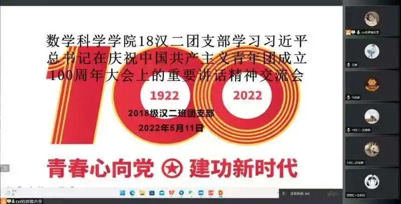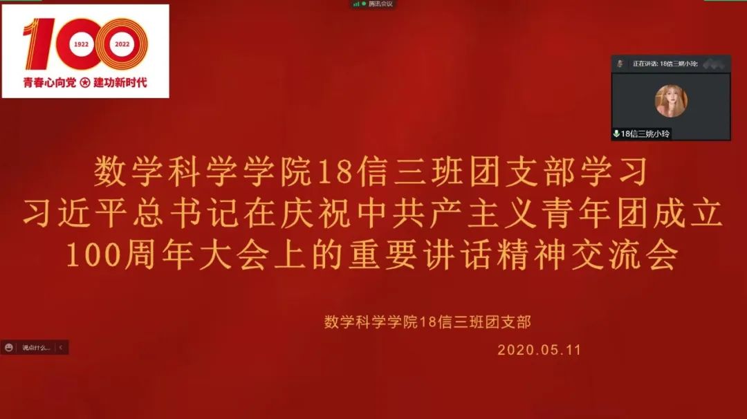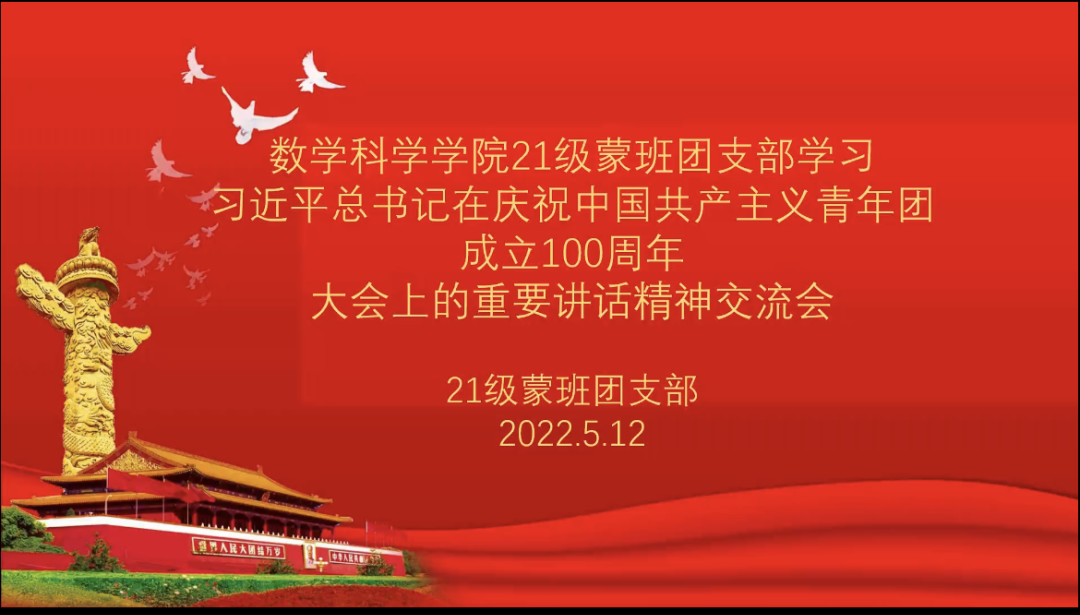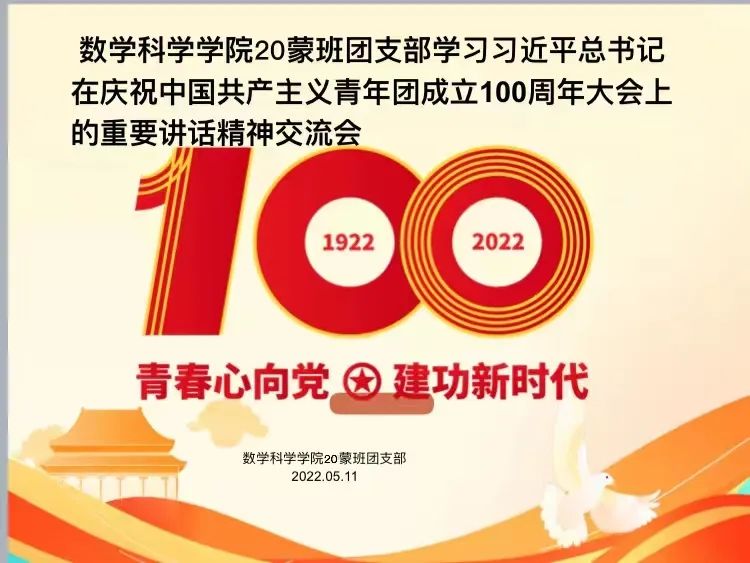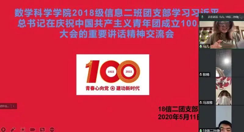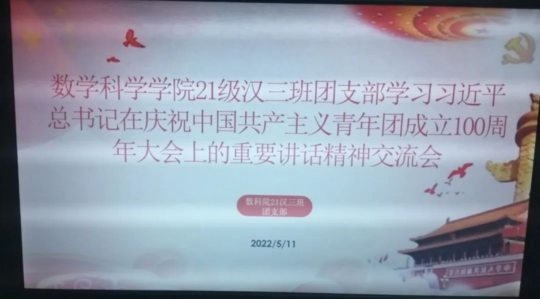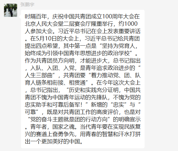 5月10日,庆祝中国共产主义青年团成立 100 周年大会在京隆重举行,习近平总书记发表重要讲话。今年会全体团员青年收看了大会盛况,聆听了总书记的重要讲话。会后,各团支部积极行动,组织开展了学习习近平总书记在庆祝中国共产主义青年团成立100周年大会上的重要讲话精神交流会,分享学习心得,感悟党的关怀,以实际行动为团的百年华诞献礼。