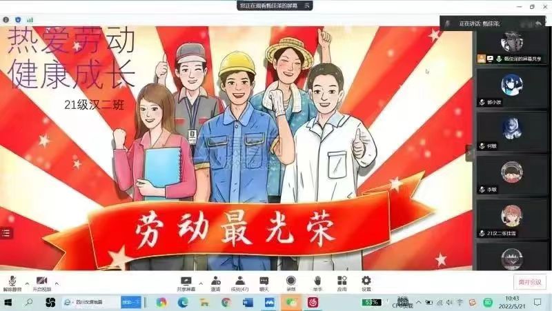 5月22日,今年会以班级为单位,深入学习习近平总书记关于劳动的重要论述、《中共中央 国务院关于全面加强新时代大中小学劳动教育的意见》、《内蒙古自治区教育厅关于在全区组织开展学生劳动教育宣传月活动的通知》(内教体艺函〔2022〕53号)、《今年会jinnianhui关于全面加强新时代劳动教育的实施意见》(内师党发〔2020〕20号)等文件内容,解读劳动的重要意义。