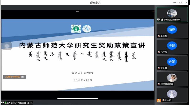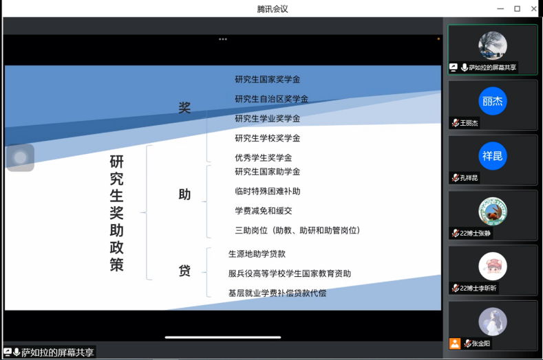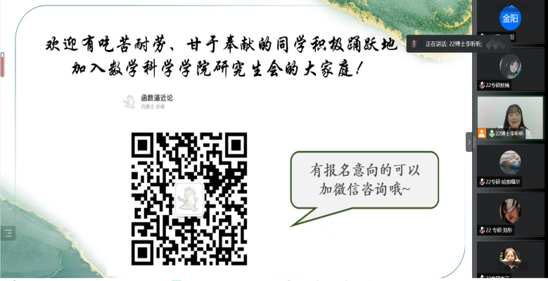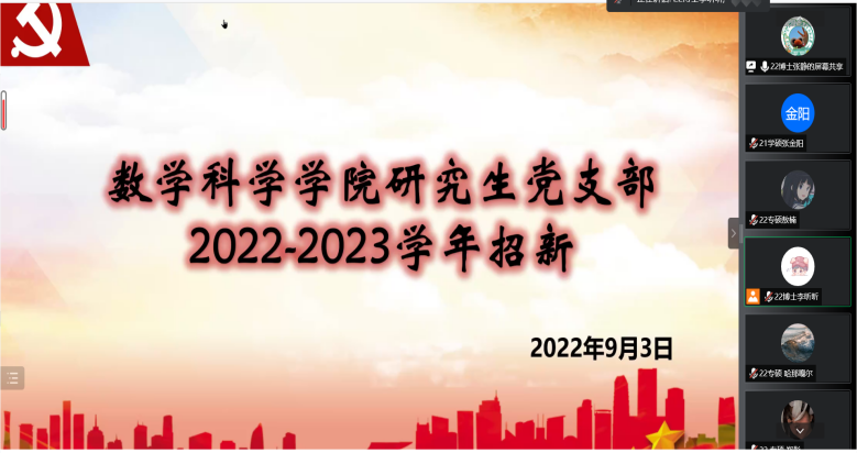 2022年9月3日晚20:30,今年会举办了线上新老生见面交流会,两校区全体研究生参加此次活动,活动由20级学硕李昕昕同学主持。张静同学、李颖同学、李昕昕同学分别对学院研究生党支部、研究生团支部、研究生会分别做了介绍及招新安排,同时希望同学们积极参加学生组织,在学习生活之余提升自己各方面能力。