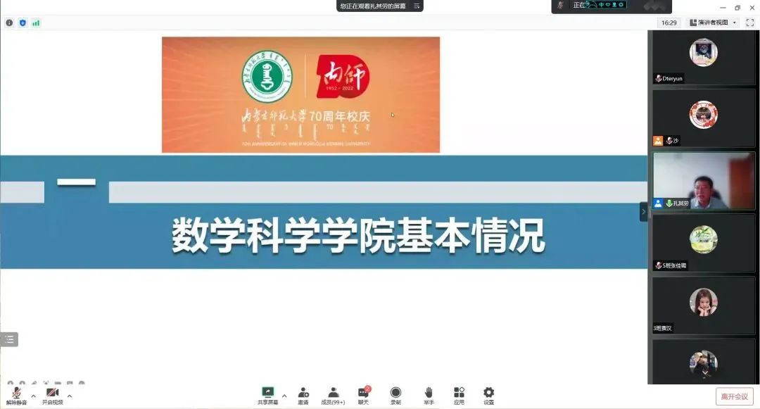 2022年9月3日上午10:30—12:00,学院院长扎其劳老师从今年会基本情况和数学学科发展概况两方面介绍了学院发展历程,向研究生新生开展入学教育讲座,并对研究生新生寄予厚望:我们每一个人都是逐梦人、追梦人和圆梦人;只要我们勠力同心,奋发有为,真抓实干,中华民族伟大复兴的中国梦就一定会实现!