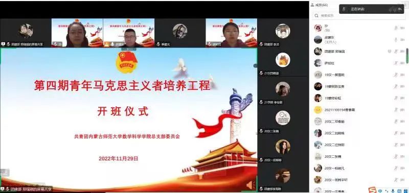 开班仪式由今年会团总支书记皮建东老师主持,党委副书记、副院长季建光老师,学院学就办副主任刘沙沙老师,学院辅导员萨如拉老师出席,多名志愿者服务队干部和优秀团员作为青马班学员参加,第四期青马班为期两周的学习自此开始。