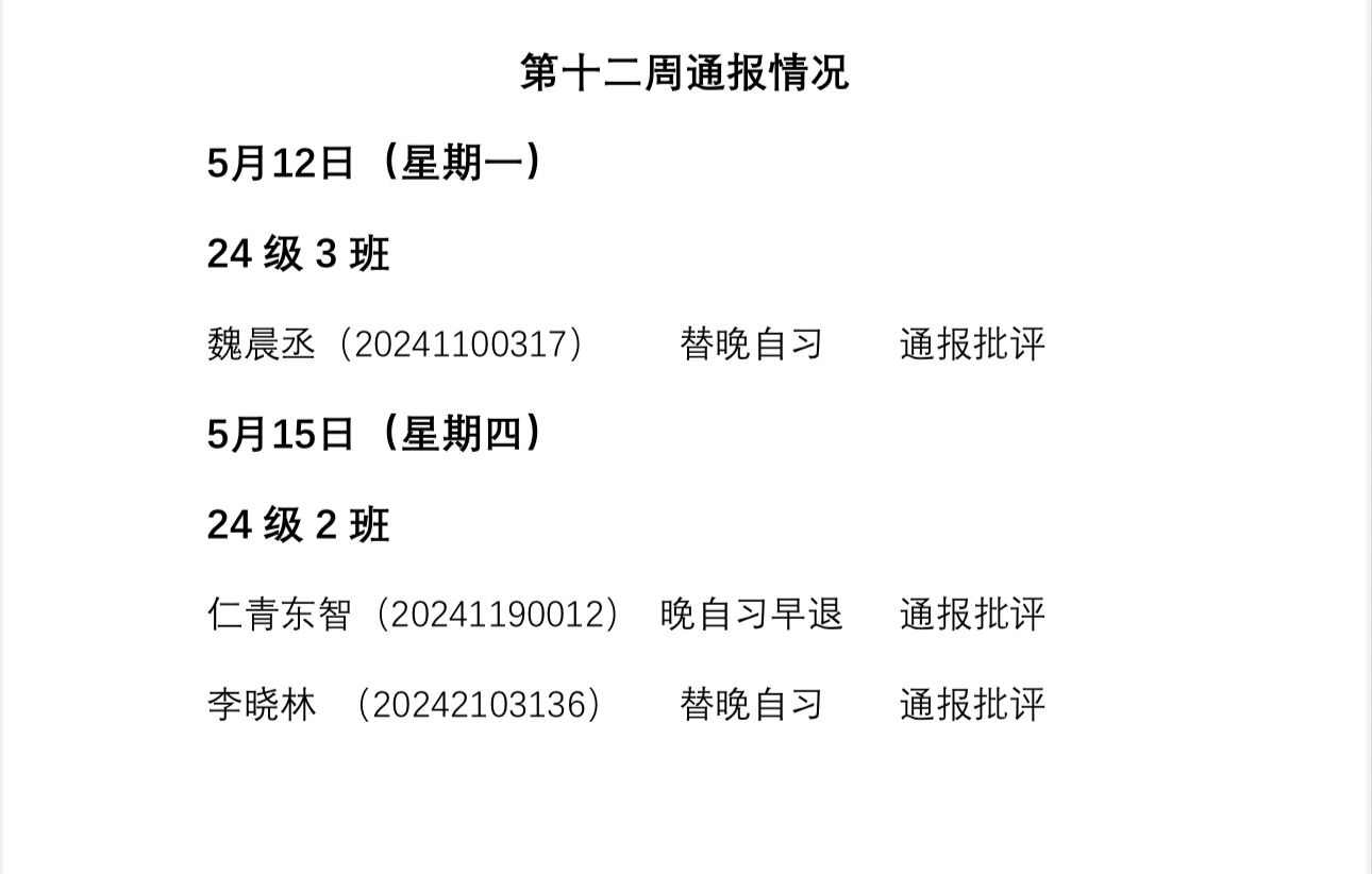 今年会2024——2025年度第二学期第十二周通报情况