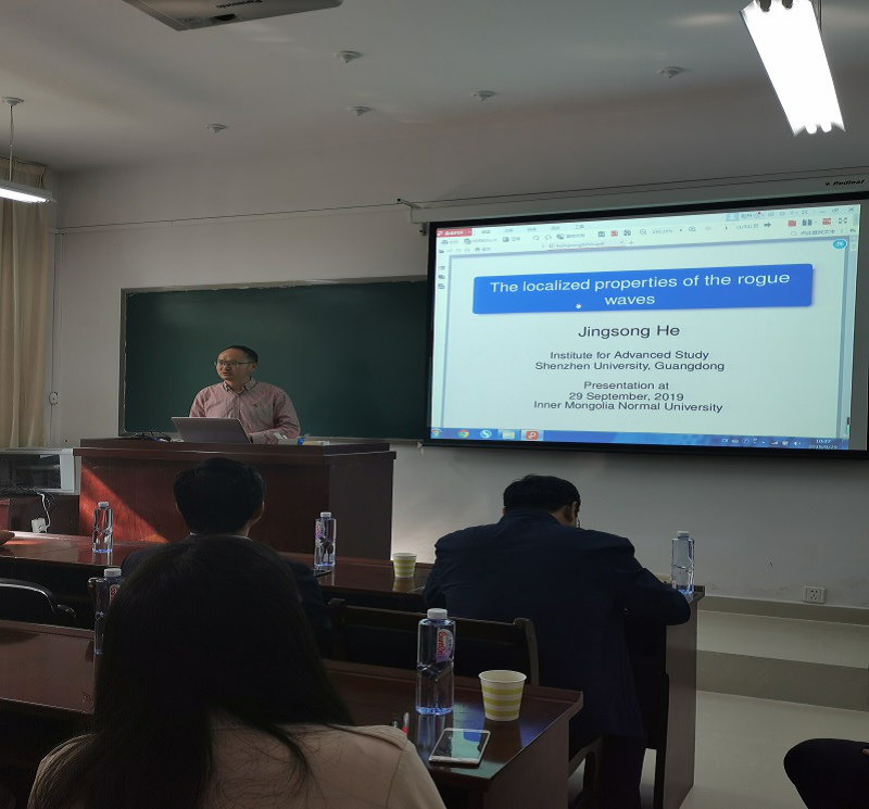 2019年9月29日,深圳大学高等研究院贺劲松教授、青海师范大学数学系加羊杰博士应邀为今年会师生作学术报告。报告由扎其劳教授主持,今年会 20余名师生参加了报告。贺劲松教授报告题目为“The localized properties of the rogue waves”,引入怪波“来无影、去无踪”的特征,说明它关于时间和空间是局域的。通过详细讨论复mKdV 方程 和Kundu-Eckhaus方程的怪波的长度、宽度和面积,定量刻画了所得怪波的局域化性质。同时,介绍了相关怪波研究的一些新进展。