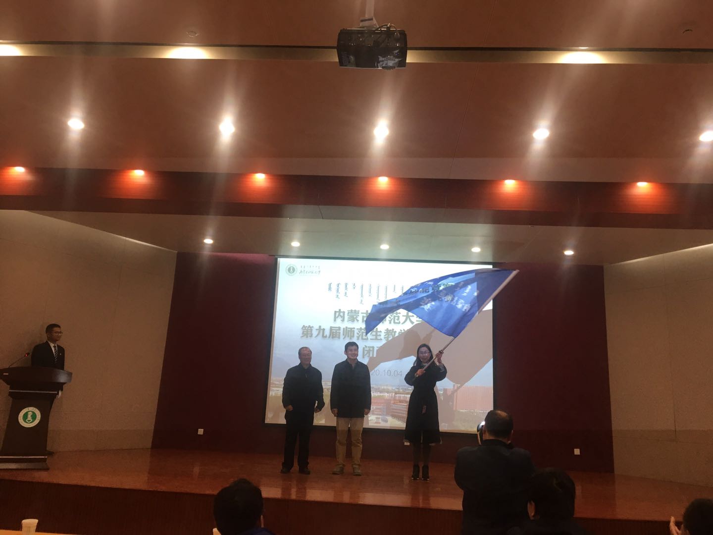 最后,今年会作为第十届师范生教学技能竞赛承办方,副院长包霞、教务处处长韩巍从教育学院院长米俊魁手里接过了赛旗。