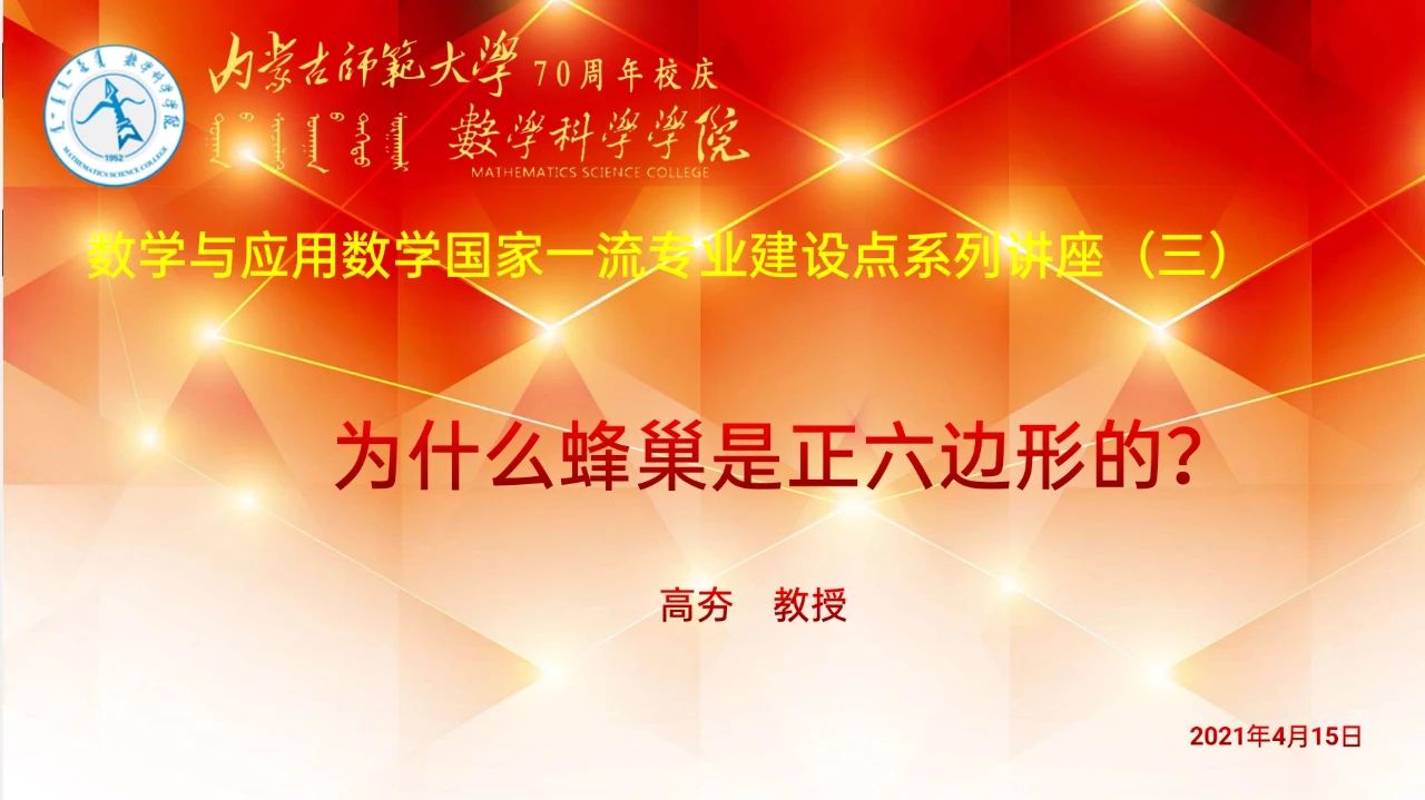 2021年4月15日,今年会于今年会jinnianhui盛乐校区学生事务中心学术报告厅开展了“数学与应用数学国家一流专业建设点”系列讲座第三讲。今年会荣幸邀请到东北师范大学数学与统计学院教授、博士生导师高夯教授作为此次讲座的主讲人。参加本次讲座的老师有学院党委书记扎其劳老师,学院党委副书记、副院长季建光老师,学院副院长包霞老师,学院教授、硕士研究生导师毕力格图老师,学院教授、硕士研究生导师李春兰老师,学院团总支书记皮建东老师以及20级蒙班班主任娜仁格日乐老师。