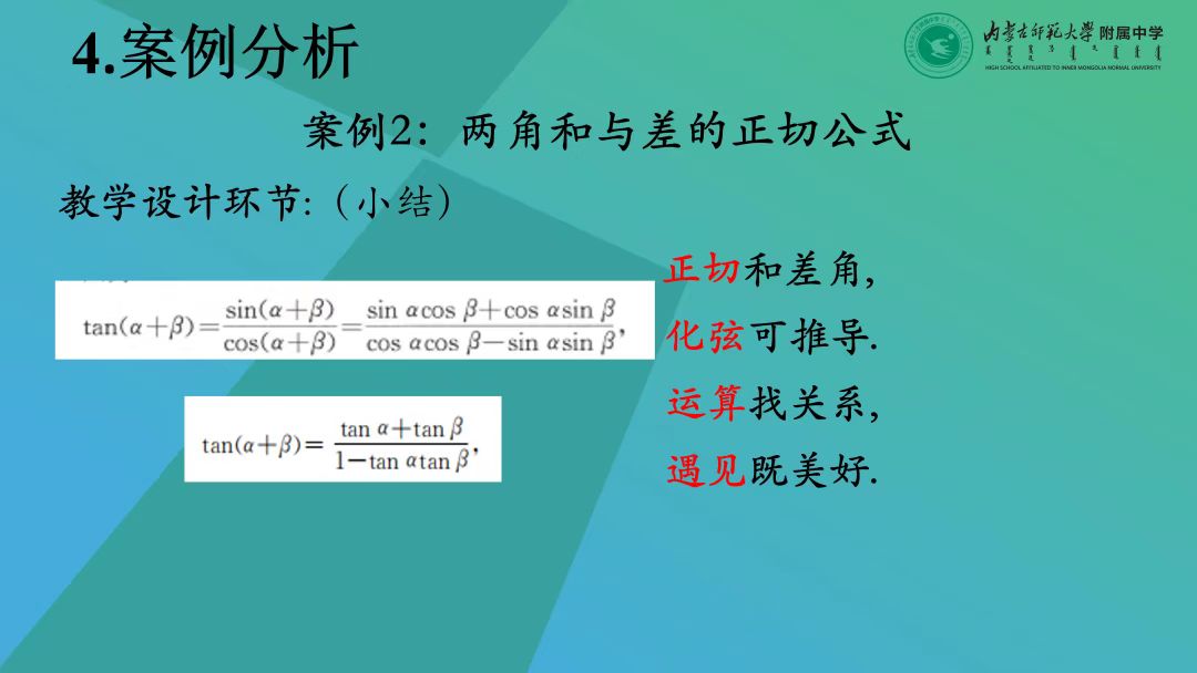 在给出如何备课的理论基础后,张生老师以《充要条件》和《两角和与差的正切公式》这两个真实案例向我们具体的展示了他是如何“用艺术的眼光备课”的。张生老师备课思路灵活又严谨,不乏趣味性,完美地体现了“用教材教”而不是“教教材”,每每到课堂的最后,总以精美的数学诗句、押韵的语句等提炼整节课的核心知识方法与思想,他的课如一个个艺术品一样,赏心悦目的同时,又能让学生满载而归。