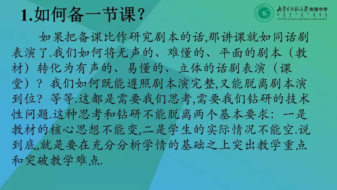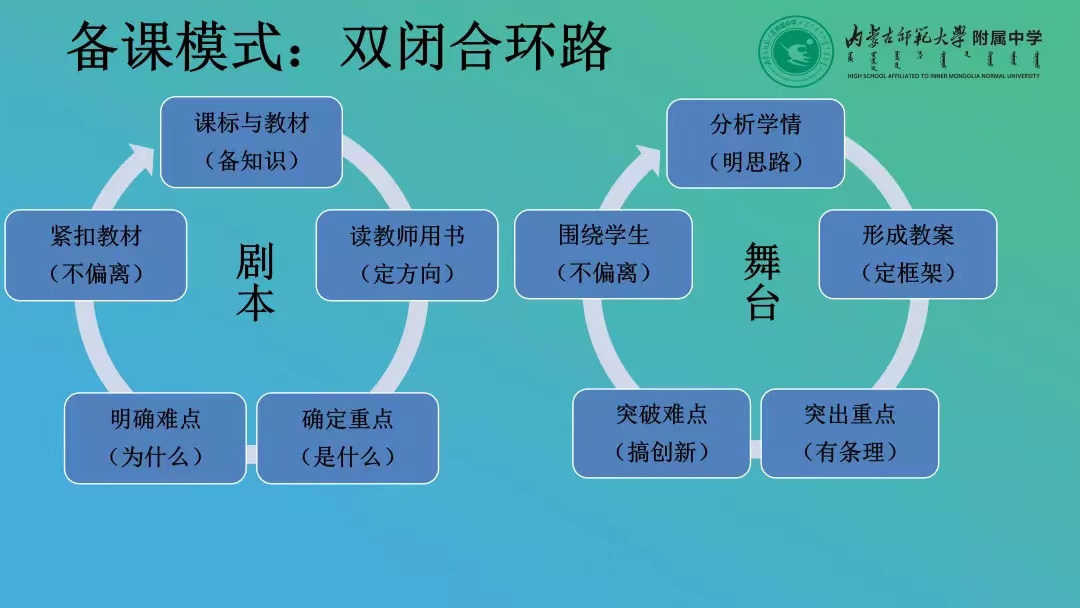 接下来,张生老师首先表达了对母校的感恩之情,紧接着,他从“如何备一节课”的问题出发,将备课比作表演话剧的剧本,提出备课应遵循“双闭合环路”模式,突出教学重点,突破教学难点。