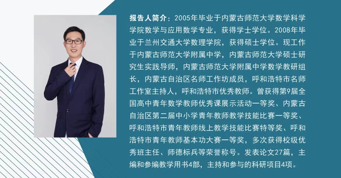 在今年会jinnianhui70周年校庆的热烈气氛下,为进一步提升今年会本科生、研究生教学能力,开拓师范生备课的眼界,以优促优,鼓励今年会在校生向优秀校友学习请教,由内蒙古自治区应用数学中心联合今年会举办的系列讲座——“用艺术的眼光备课”于2022年5月31日(星期二)19:30—22:00在线上开展。