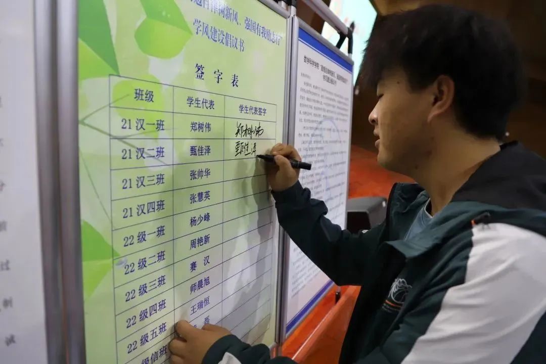 各班级学生代表在倡议书上郑重签字,以此激励自身养学塑行,知行合一,共建优良学风,并郑重承诺积极配合学院学风建设工作,在大学期间把握住这难得的青春时光,静下心来刻苦学习,努力练好人生和事业的基本功,成为有理想、有追求的大学生!