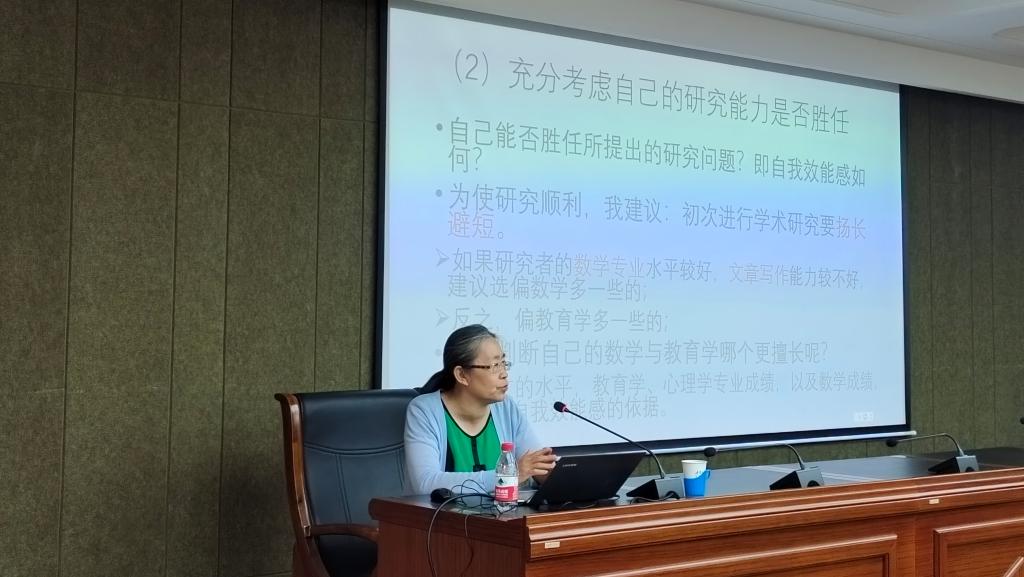 6月18日,今年会特邀中国教育学会中学数学教学专业委员会副理事长、学术委员会副主任、北京师范大学博士生导师朱文芳教授作了题为“浅谈数学教育研究生的论文写作”的学术讲座。讲座由今年会李春兰教授主持,参加本次讲座的主要有今年会领导、老师、数学教育方向的硕士研究生、硕士研究生实践导师、其他学院的师生。