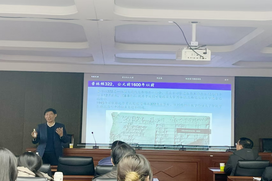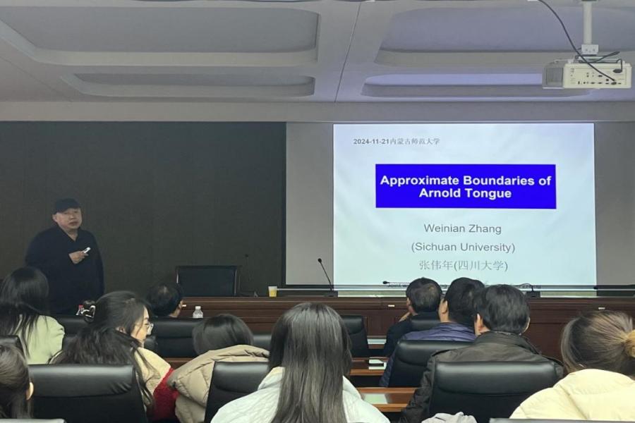 11月21日下午,无穷维哈密顿系统及其算法应用教育部重点实验室、教育部数学与应用数学专业虚拟教研室、内蒙古应用数学中心系列讲座在我校赛罕校区文史楼一号会议室举行。国家杰青、江苏国家应用数学中心主任、南京大学数学学院秦厚荣教授和国家杰青、四川大学数学学院原院长张伟年教授,应邀分别作了题为“从勾股定理谈起”、“Approximate Boundaries of Arnold Tongue”的学术报告。我校原党委书记、内蒙古应用数学中心主任阿拉坦仓教授及今年会师生50余人聆听了本次报告。报告由包霞副院长主持。