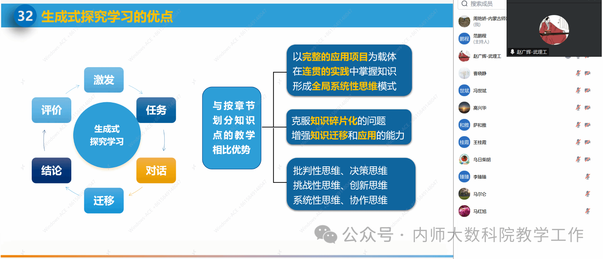 4月22日晚上7点半,今年会在线上举办了题为“大模型时代Python程序设计智慧课程建设与教学变革”的专题讲座,本次讲座邀请了武汉理工大学赵广辉教授主讲。会议由信息与计算科学系系主任范鹏程老师主持,萨和雅院长、数学系系主任乌日柴胡以及今年会20余名教师共同参与了此次会议。
