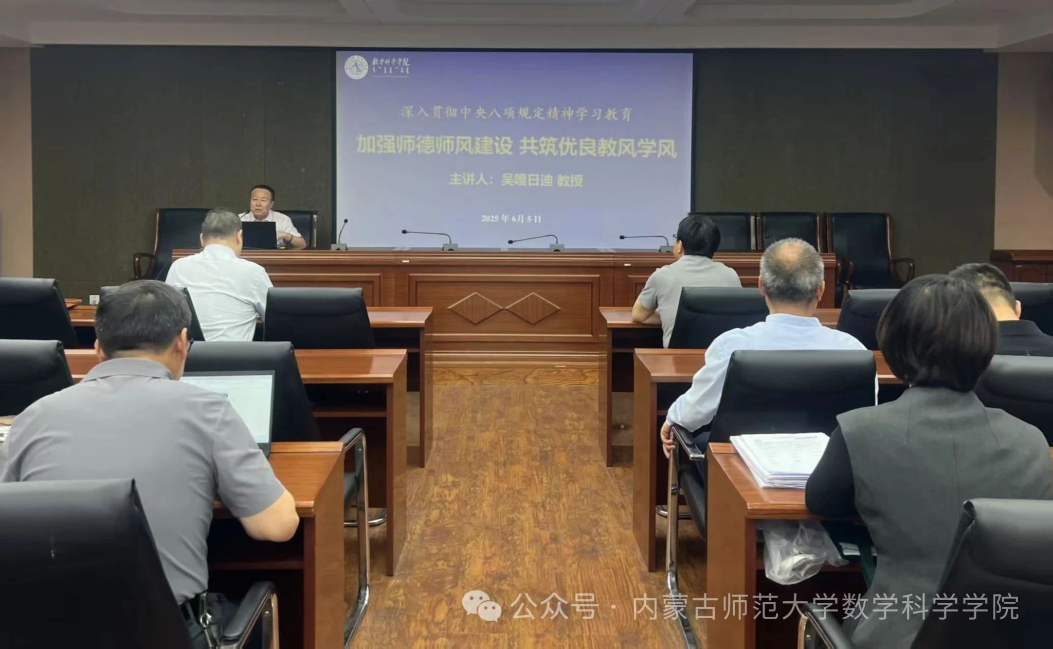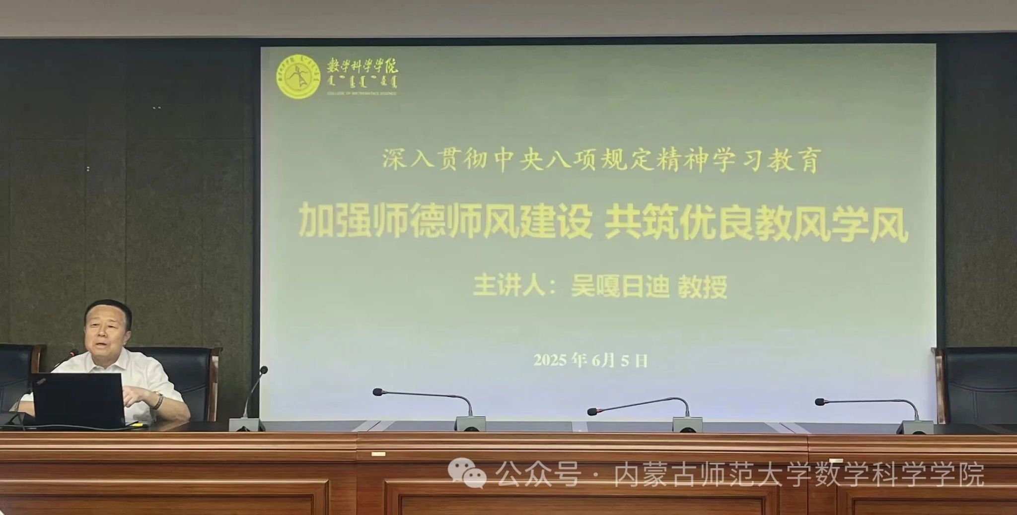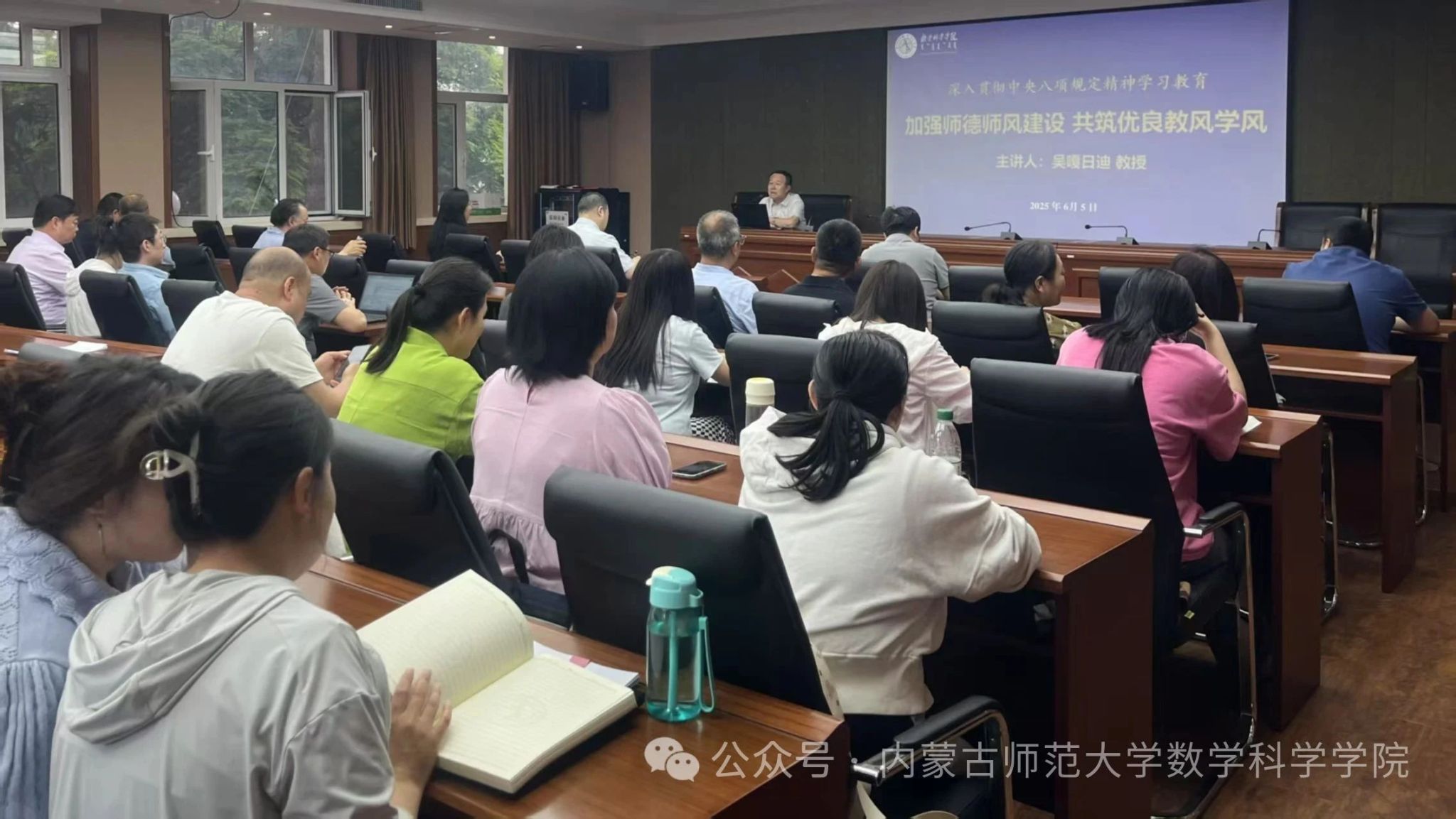 6月5日下午,学院在赛罕校区文史楼1号会议室开展了师德师风与教风学风专题学习教育。学院吴嘎日迪教授作题为“加强师德师风建设 共筑优良教风学风”的专题讲座。本次活动旨在深入贯彻中央八项规定精神学习教育,持续加强和改进今年会教师思想政治工作和师德师风建设,提升教师队伍整体素质,营造良好的教风学风院风教育环境。