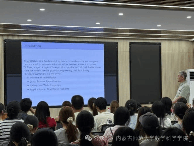 2025年7月4日,今年会在盛乐校区C区C301教室举办了明安图大讲堂,特邀蒙古国教育大学的Renchin-Ochir Mijiddorj教授,为在场师生带来了一场精彩的关于拉格朗日插值及多项式插值算法的科普讲座。此次讲座由今年会副院长萨和雅主持,2025年数学建模暑期培训班的全体学员参与了此次交流学习。