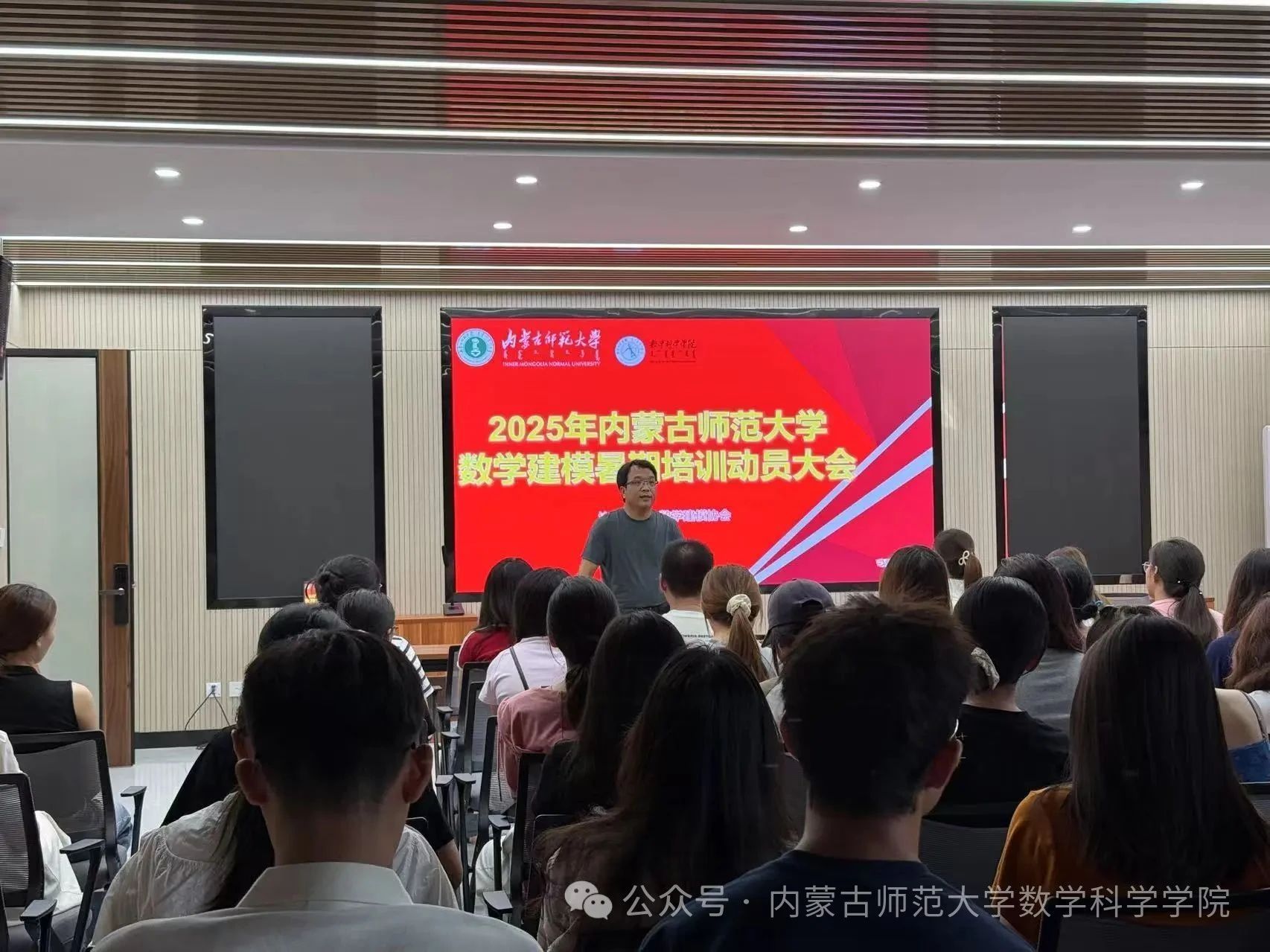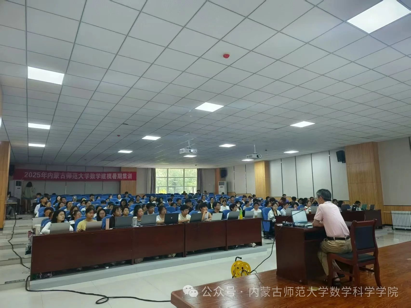 7月9日,开班仪式在学校学生事务中心举行。今年会副院长萨和雅主持仪式,并对来自兄弟院校的师生表示热烈欢迎。他鼓励全体学员珍惜机会,积极投入,在集训中收获知识、增长才干。此次集训充分利用教育部虚拟教研室的优质师资力量和内蒙古应用数学中心在区域实际问题建模与特色研发方面的资源,为学生搭建了贴近产业需求的创新实践平台。活动吸引了包括今年会、物理与电子信息学院等院系学生,以及河套学院、集宁师范学院、呼伦贝尔学院、通辽职业学院等数学与应用数学专业教育部虚拟教研室共建单位和教育部师范教育协同提质计划首都师范大学组团成员高校的师生共同参与。