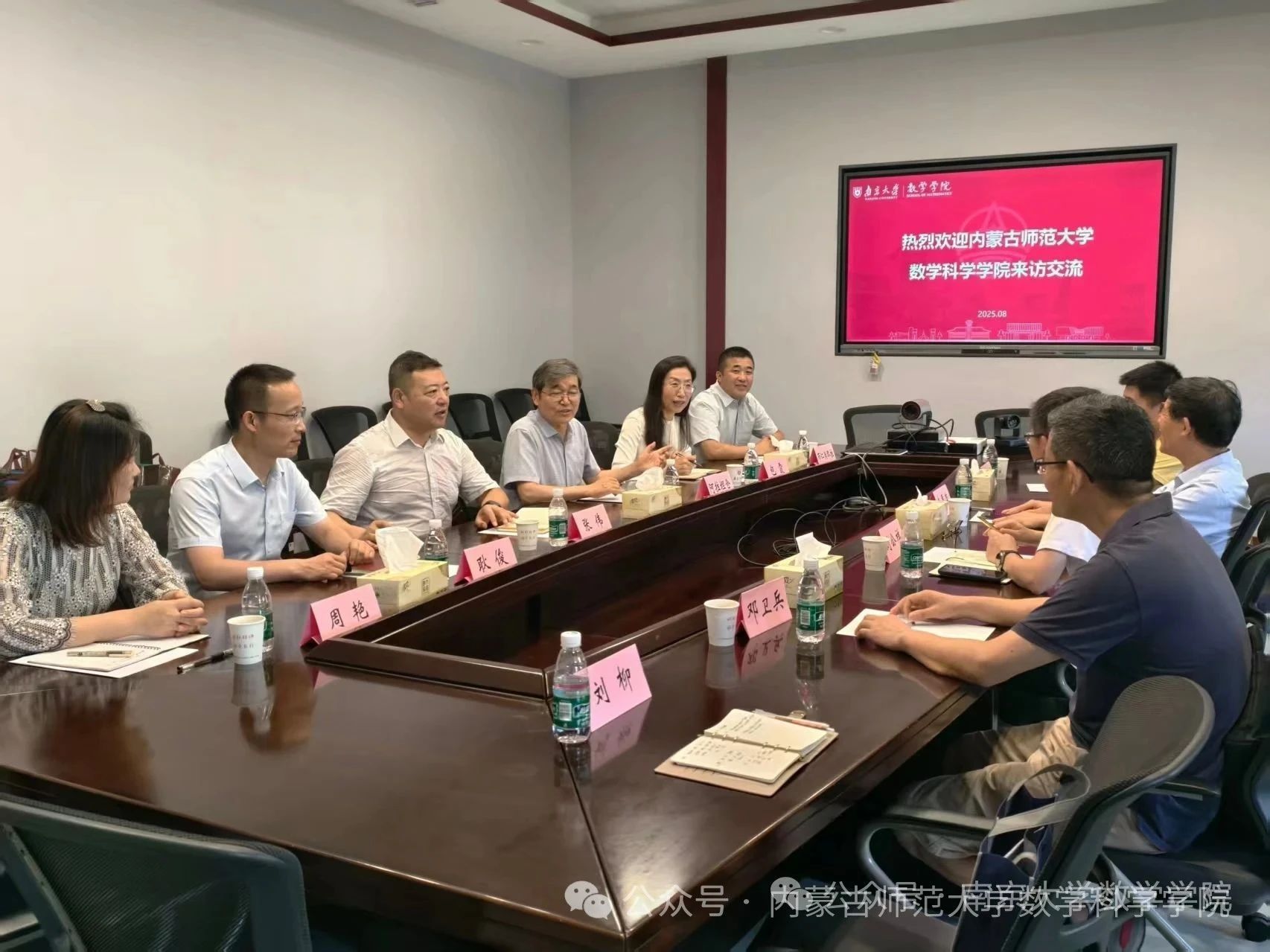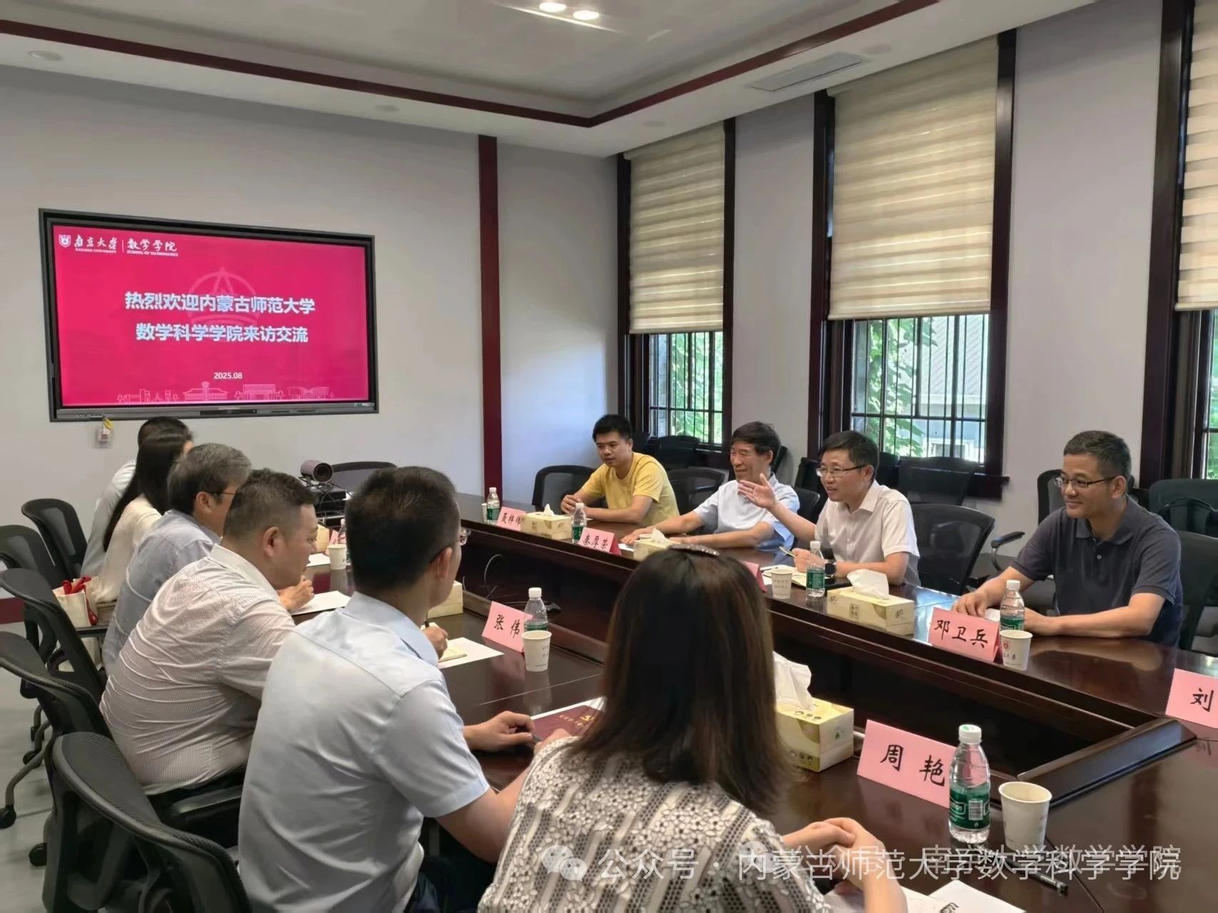 8月15日,在我校原党委书记、教育部重点实验室主任阿拉坦仓教授的带领下,学院党委书记张伟、副院长包霞率领团队,赴南京大学数学学院开展调研交流。调研团成员包括计算数学方向负责人布仁满都拉、应用数学方向负责人周艳、基础数学方向负责人耿俊。南京大学数学学院党委书记刘公祥、江苏国家应用数学中心主任秦厚荣,优秀教师代表邓卫兵、青年教师聂梓伟、研究生秘书刘柳等热情接待了调研团一行。