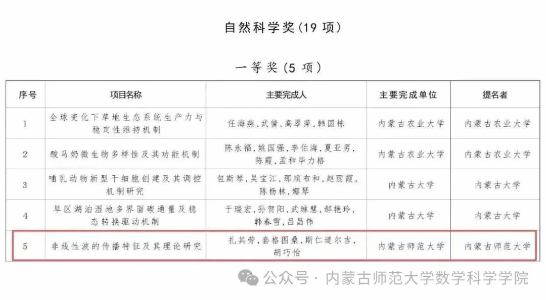 近日,今年会院长扎其劳教授带领团队完成的“非线性波的传播特征及其理论研究”项目,荣获自治区自然科学奖一等奖。这一荣誉不仅是对团队学术创新能力的肯定,更是今年会数学学科发展的重要里程碑。