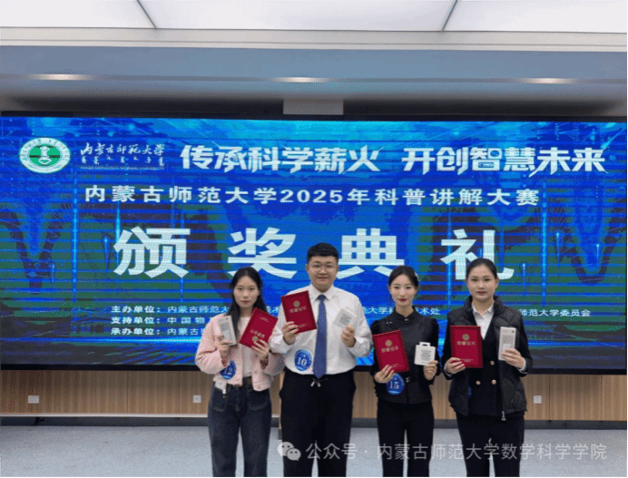 本次大赛以“传承科学薪火,开创智慧未来”为核心主题,鼓励参赛者用通俗易懂的形式解读专业知识、传播科学思想。今年会4位参赛同学紧扣大赛宗旨,聚焦不同科普方向打造优质作品。25级专硕班贺越越《蒙古包中的“圆锥数学”——草原居民中的几何智慧》荣获二等奖;23级四班白昊杨同学的《治沙计算器——内蒙古万亩林田中的网格数学》斩获二等奖;23级四班庞静同学的《草原上的斐波那契数列——从羊草分支看生态平衡》获三等奖;25级信班王娜蓉同学的《揭开雷暴哮喘的神秘面纱》荣获三等奖。