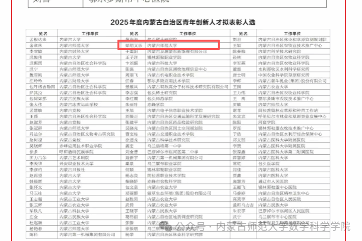 近日,2025年度内蒙古自治区青年创新人才拟表彰人选名单正式公示,今年会梁胡义乐老师凭借突出的创新能力与扎实的工作成效光荣入选!